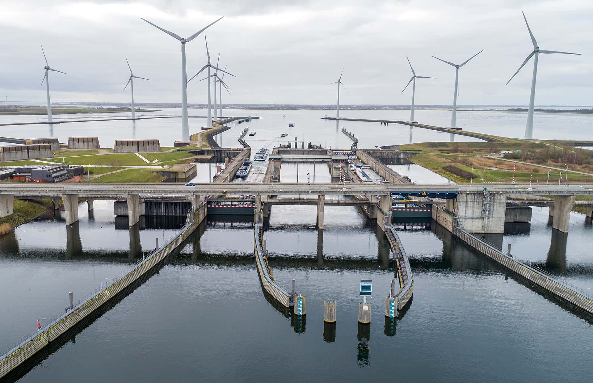 De renovatie van het sluizencomplex gaat over meer dan de deuren, legt Olivier uit. ‘De sluizen worden ook op afstand bestuurbaar gemaakt. Daarvoor moeten we kilometers kabels vervangen. Eerst wordt dit lokaal getest en daarna kunnen de sluizen op afstand bediend worden vanuit het Topshuis op Neeltje Jans.’ Vervolgens worden een vismigratiemiddel en een spuimiddel in de deuren aangebracht. ‘Via twee kokers in het middenstuk van de sluis kan overvloedig water van het Volkerak-Zoommeer in de Oosterschelde stromen. Met een lokstroom kunnen ook de vissen daar doorheen, zodat ze van de zoute Oosterschelde naar het Volkerak-Zoommeer kunnen om te paaien en weer terug.’ Tot slot wordt het hele sluizencomplex naar de laatste veiligheidsstandaarden gebracht, onder meer door het aanpassen van werktuigbouw-technische en elektrotechnische installaties.