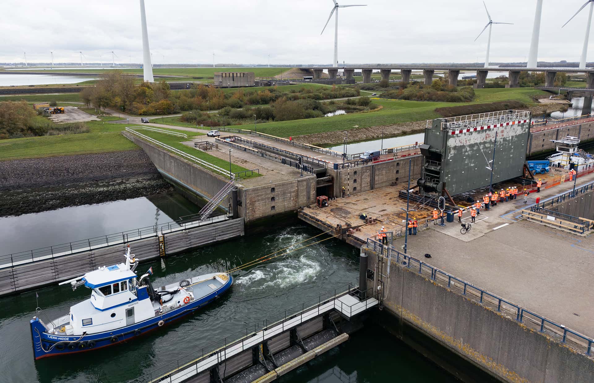 Na een voorbereiding van ruim een jaar, werd op 15 oktober de eerste deur uitgehesen en naar de Sloehaven in Vlissingen gebracht voor groot onderhoud en renovatie. ‘Dan moet je denken aan stralen van de deuren en vervangen van de bekabeling. Een belangrijke functie van de sluizen is het scheiden van het zoete en het zoute water. Tijdens de renovatie vervangen we de huidige zoet-zoutscheiding door een nieuw systeem met bellenschermen, gecombineerd met het spoelen van zoet water. Daarvoor moeten we de deuren aanpassen. In de deuren komen zes rinketten, soort gaten die open en dicht kunnen, waardoor het zoete water naar de Oosterschelde spoelt.’