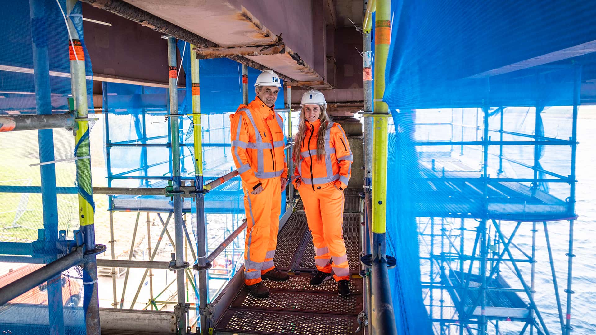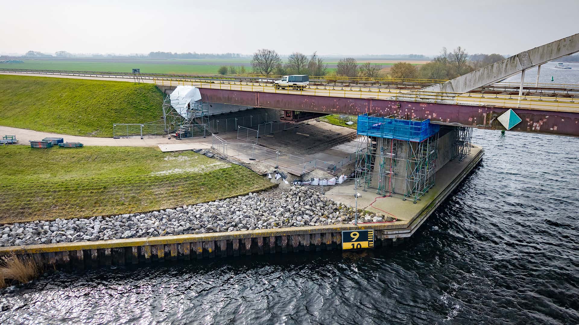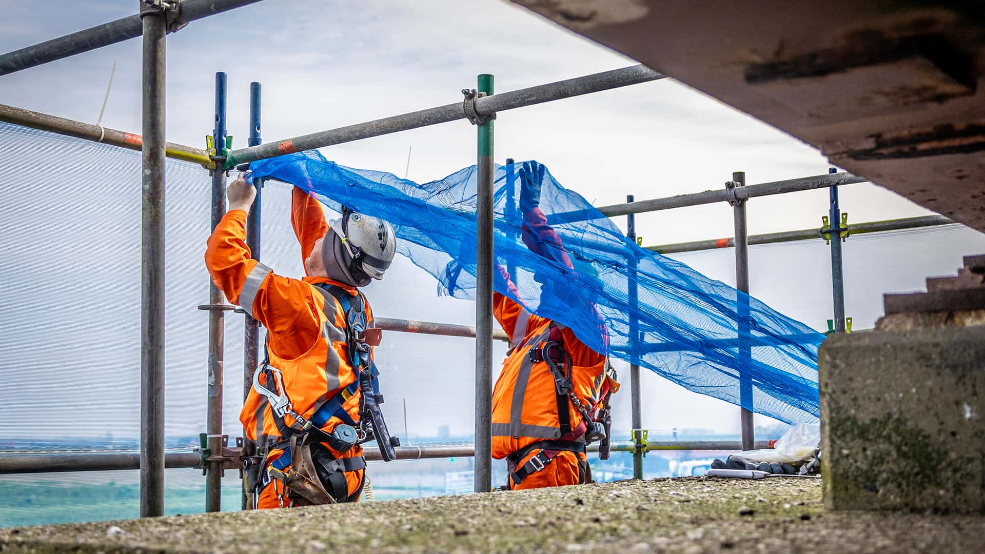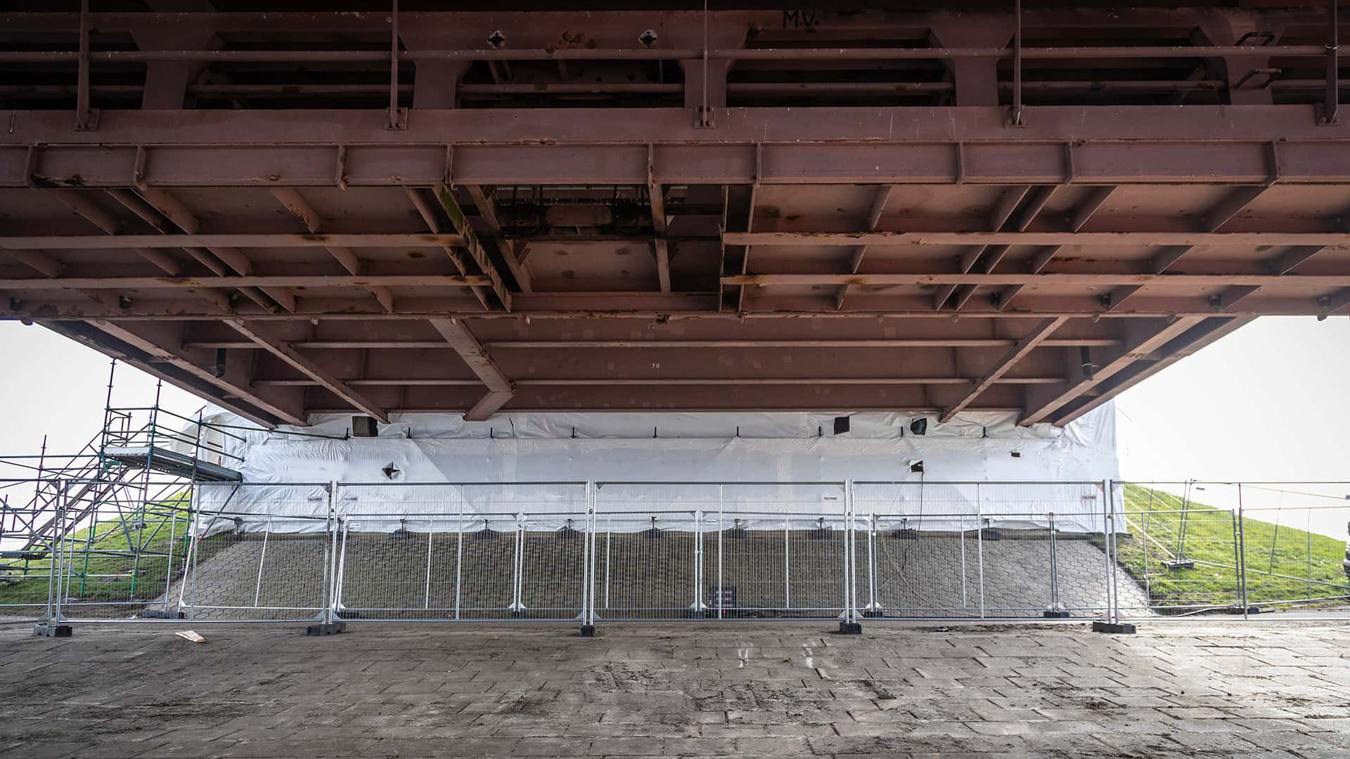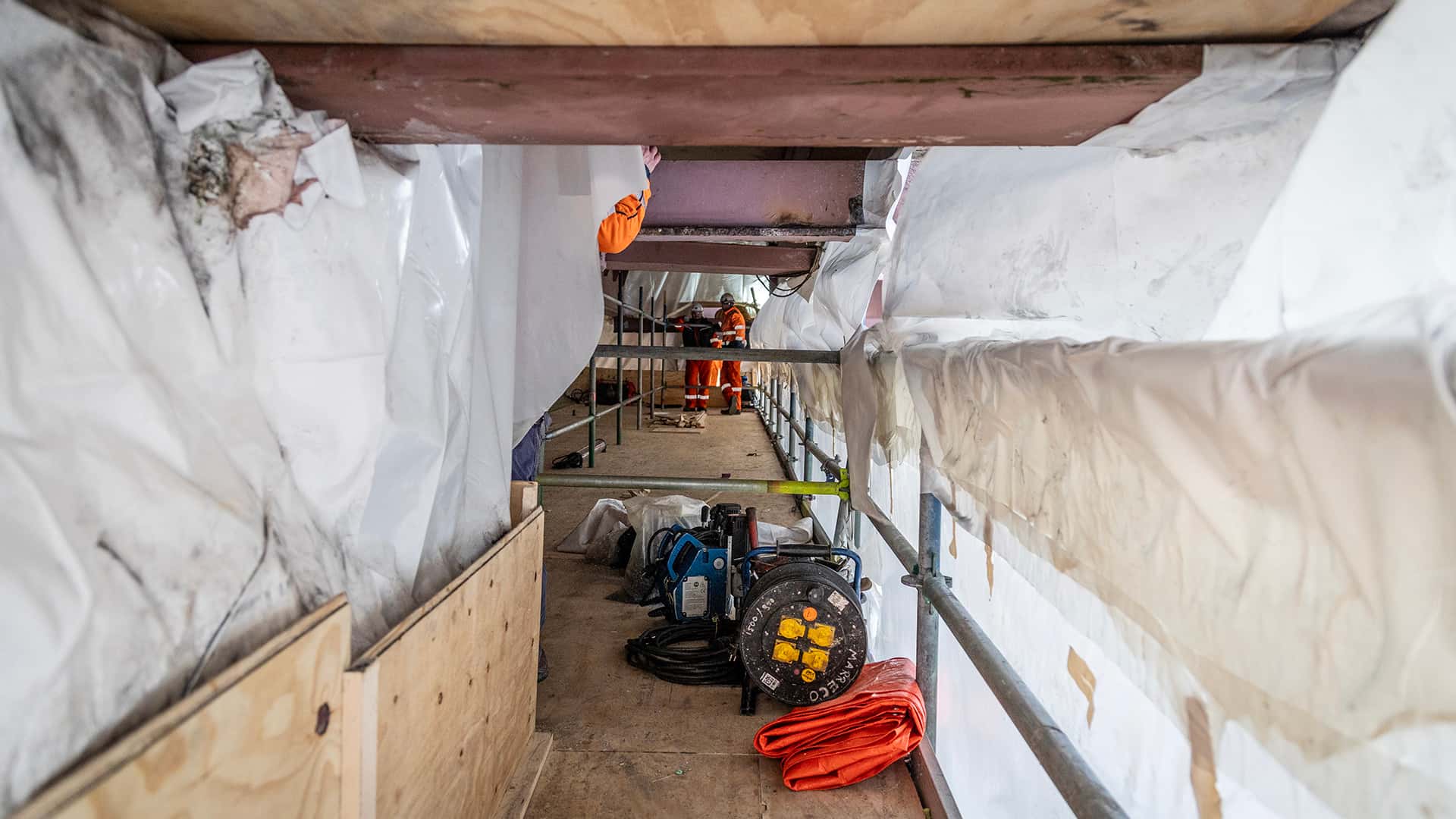Omdat we bij de Slaakbrug werken op plekken waar vogels graag nestelen, kozen we voor een praktische oplossing: de steigers zijn volledig ingepakt met krimpfolie. ‘Zo maken we het voor vogels moeilijker om er een nest te bouwen’, zegt adviseur omgeving Jeanine Bruijnes. ‘Dat voorkomt dat we tijdens het werk maatregelen moeten nemen om verstoring te voorkomen. Tegelijkertijd heeft het inpakken nog een belangrijk doel: het zorgt voor een afgeschermde, geconditioneerde werkruimte. Zo kunnen werkzaamheden zoals lassen en conserveren onder de juiste omstandigheden en veilig worden uitgevoerd. Ook voorkomt het dat materialen, zoals straalgrit of verfdeeltjes, in de omgeving terechtkomen.’ De folie zit niet om de brug zelf, maar om de steigers die we gebruiken om het werk uit te voeren. Tijdens het werk controleren we regelmatig op en rond de brug of vogels niet toch een nest bouwen.’
