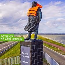 Om te attenderen op het belang van klimaatbeleid hulde Greenpeace Cornelis Lely in een reddingsvest